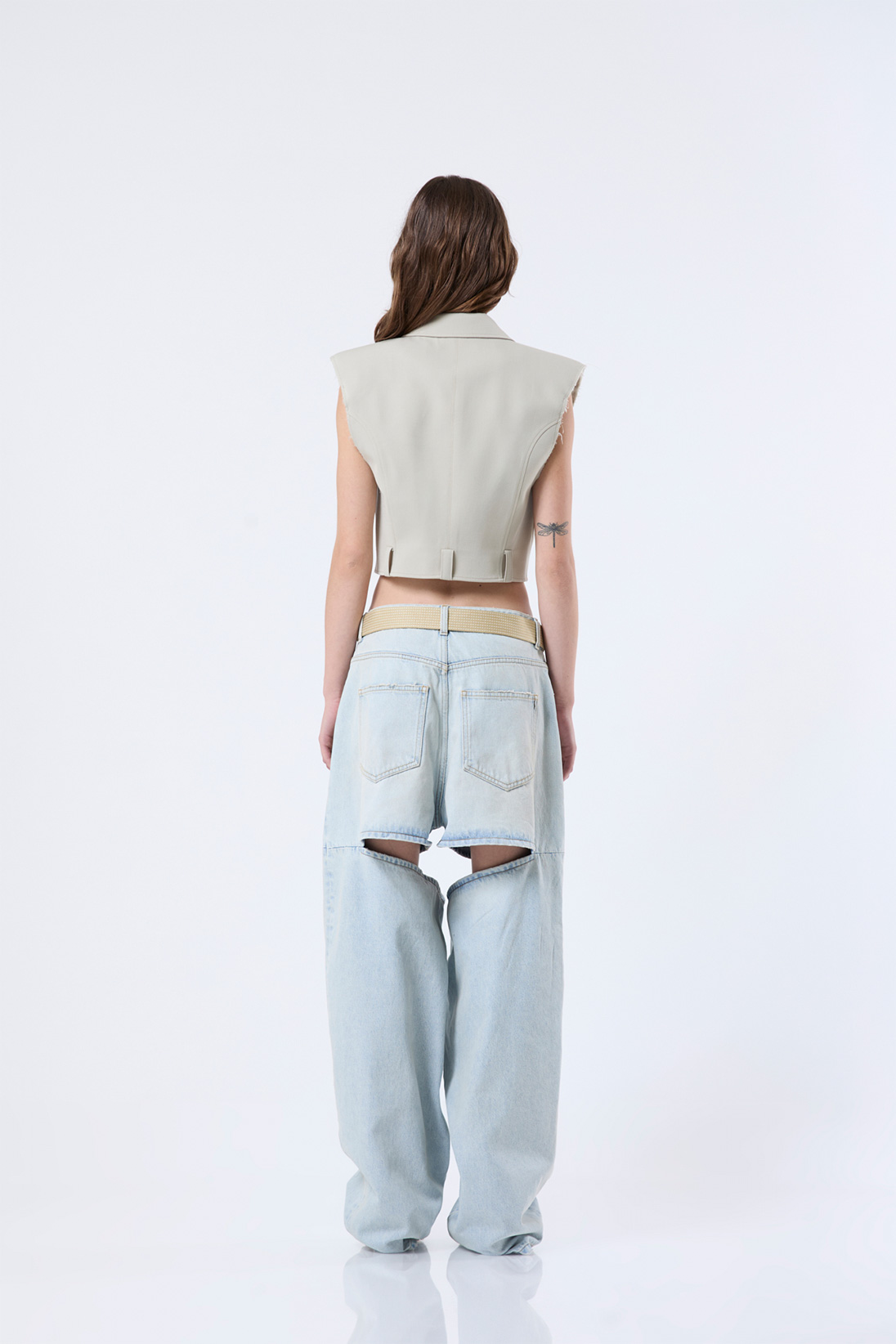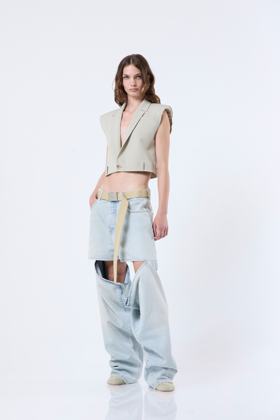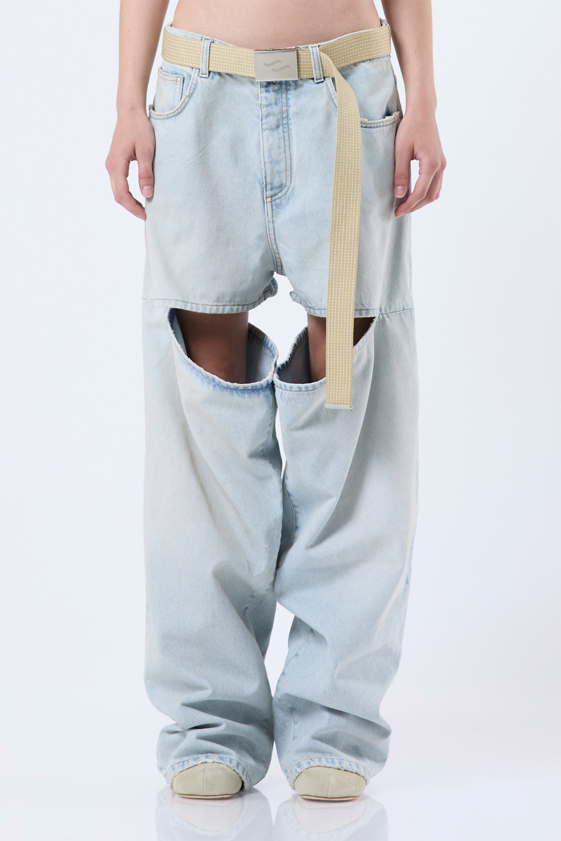 Oversized denim jeans with cuts and sliding belt