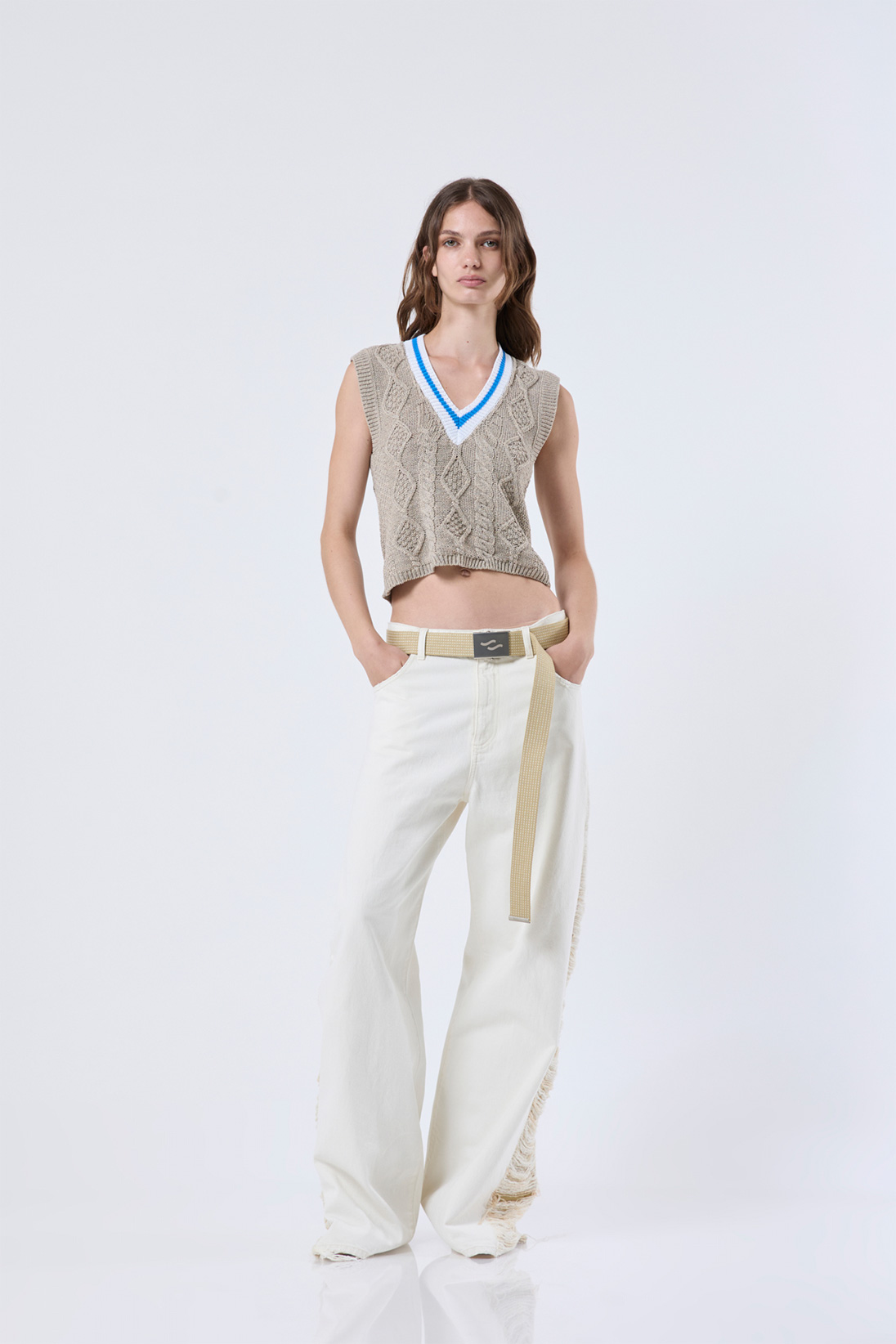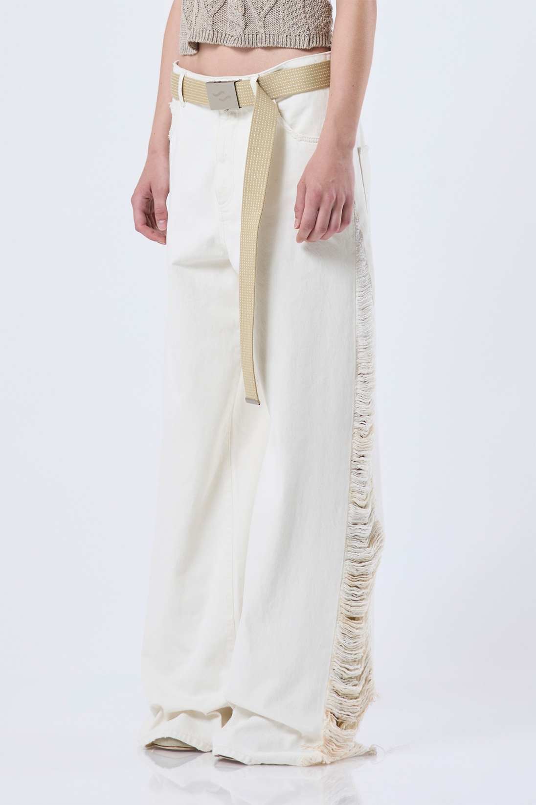 Oversized denim jeans with destroied effect and sliding belt