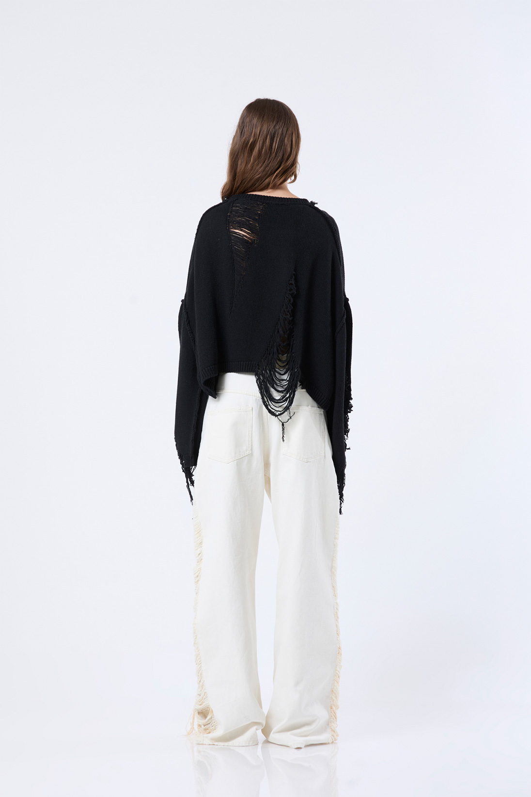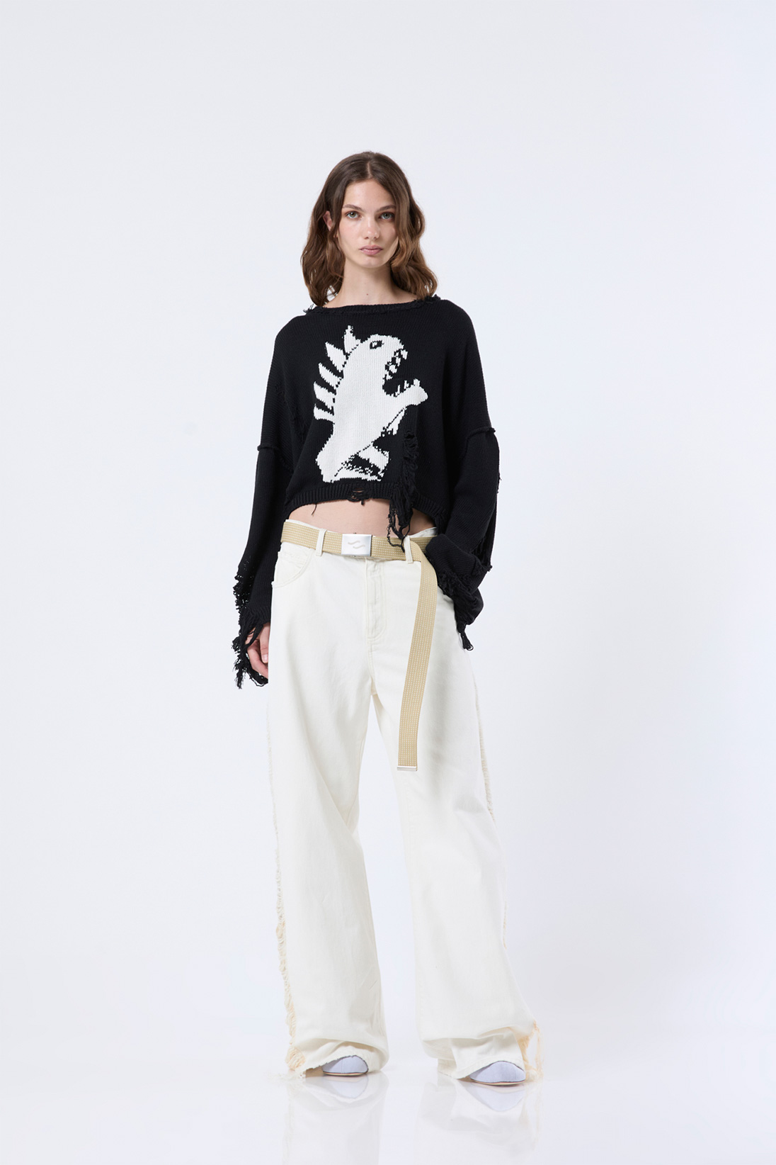 Oversized knit crop sweater with a front intarsia graphic, distressed detailing, and frayed edges
